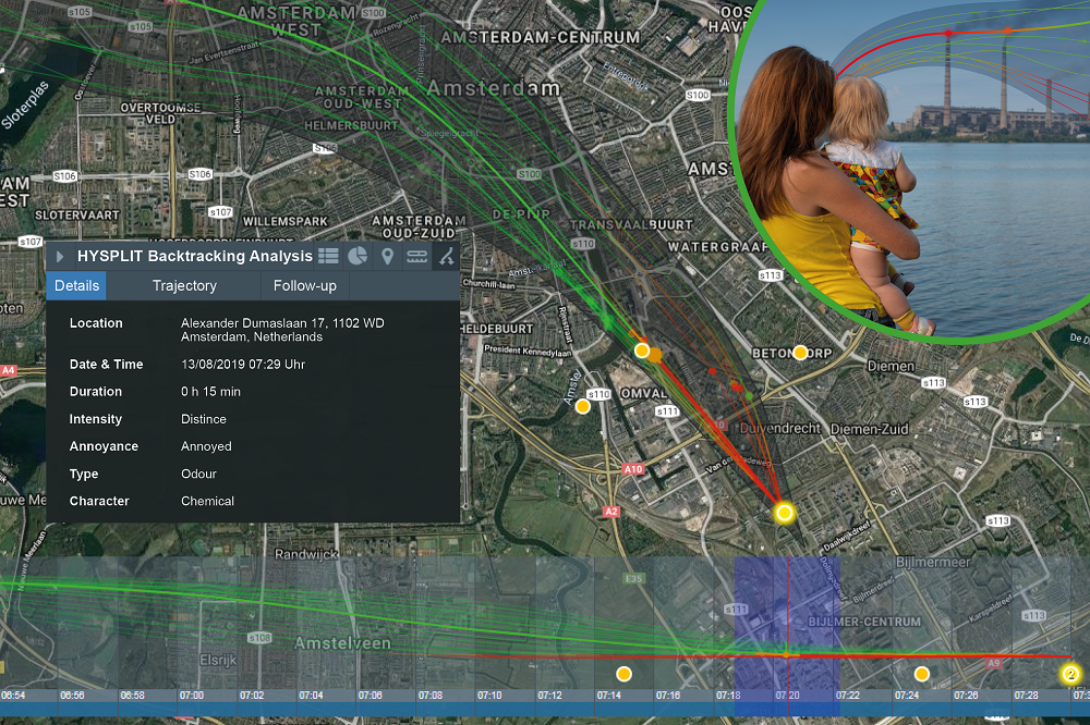 Ortelium bietet eine komplexe Echtzeit-Backtracking-Funktion, die mittels hochaufgelöster Wetterdaten und Rückwärtstrajektorien Flugbahnen von Luftteilchen unmittelbar analysiert und somit potenzielle Quellen von Beschwerden lokalisiert.