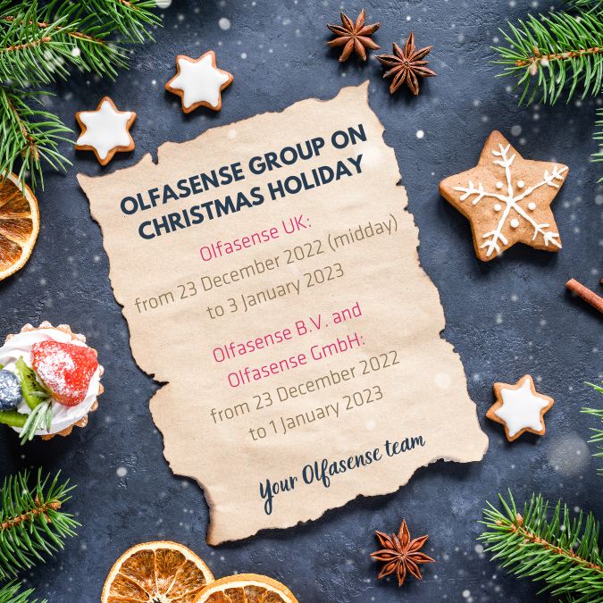 The Olfasense UK offices will be closed from 23 December 2022 (midday) to 3 January 2023.