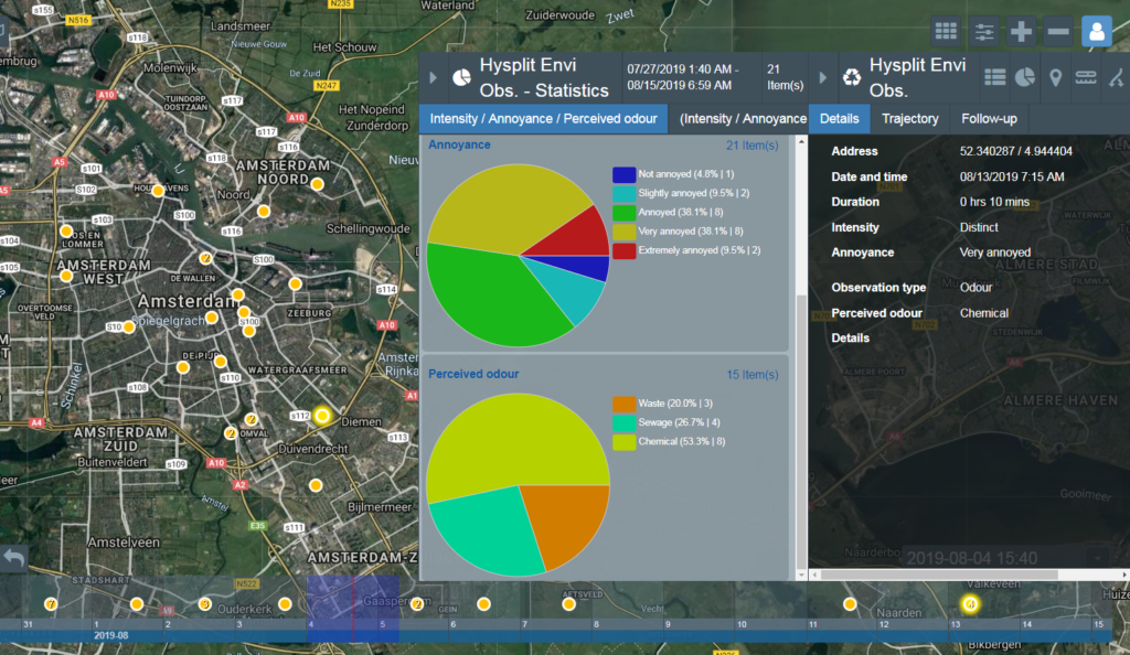 Ortelium le ofrece la opción de integrar las capacidades de trayectoria inversa para analizar instantáneamente la viabilidad de las observaciones de olores. A través de la modelización avanzada de dispersión Hysplit (modelo híbrido lagrangiano de trayectoria integrada de partícula única), simulación meteorológica y la modelización de trayectorias inversas, puede localizar la fuente potencial demalos olores.