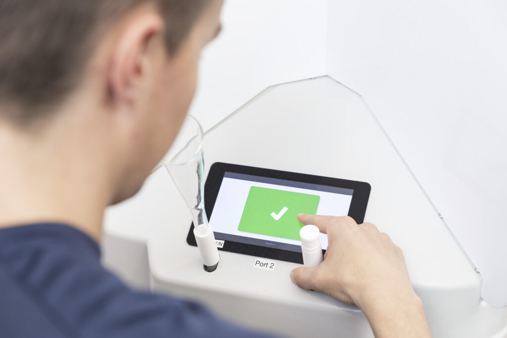 El TO9 evolution es un olfatómetro con diseño ergonómico que se basa en el principal sensor de la olfatometría: la nariz humana. Nuestros ingenieros han trabajado con diseñadores industriales para centrarse en la interacción entre el hombre y la máquina. Las máscaras nasales que se ajustan en altura permiten que los panelistas se sienten siempre en la posición vertical adecuada, sin importar su altura. Tiene una pantalla táctil en el centro, que es de muy fácil acceso y adecuada para usuarios diestros y zurdos.